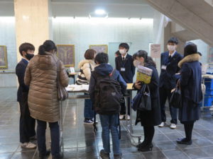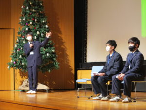 また、オンラインでは度々行ってきた生徒座談会を、本日は皆さまの前で3人の生徒による学校生活についてのプレゼンを披露しました。中3の西 大河君には蝶ヶ岳登山と糸魚川プロジェクトの話を、高2の高瀨皓大君と高3の岩崎秀直君には海外研修体験の話をしてもらいました。また、3人それぞれに自身の得意分野や学びの取り組みなどの紹介もしてもらいました。数年前まで受験生の皆さまと同じ立場だった在校生の声は、きっとリアルに届けられたのではないかと思っております。3人は、座談会終了後の講堂ロビーで、自学ノートやタブレットを用いながら、受験生や保護者の質問・相談にも親身に答えていました。