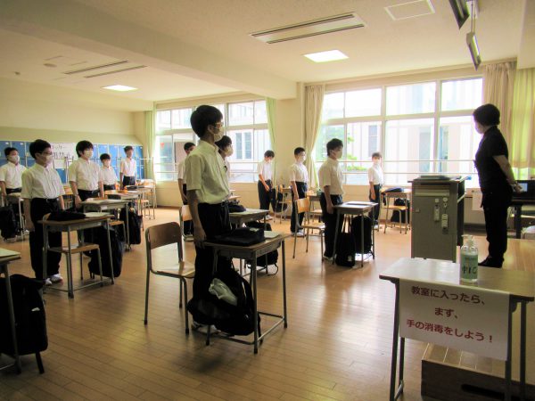 本日の分散登校は、高校2年生と入学式以来の登校となる中学1年生でした。オンラインで繋がっていたとはいえ、生徒に直接会うこと自体が少ない中1学年団の先生方は、朝からソワソワ緊張した様子で生徒たちの登校を心待ちにしていました。教室で生徒を出迎えた中1B担任の伊藤航大教諭は、「会えたのは約2か月ぶりだけれども、もう大きくなっている気がする…」と、生徒の成長に驚いていました。