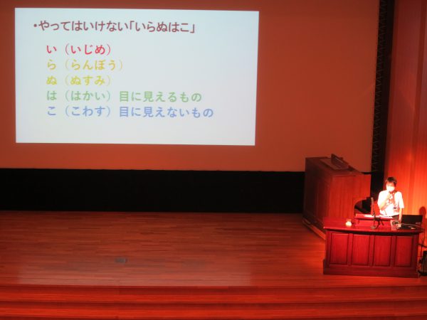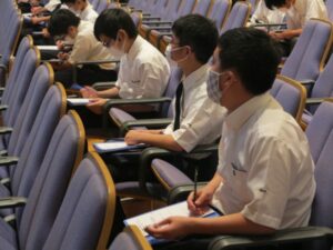 HRが始まると元気に挨拶をして、提出物や今日の予定の確認を済ませました。そして、クラスごと順に講堂へ移動し、新入生オリエンテーションを行いました。通例であれば、多彩なアクティビティプログラムで進められるオリエンテーションですが、今年は命を守るための学びの時間を最優先にしました。清水副校長、久保チャプレン、宮聡学年主任、伊藤豊教育統括部長から、大事な話が続きました。生徒たちにとって、一度に多くの先生方の話を聞くのは大変だったと思いますが、メモを取りながら一生懸命向かい合う姿に感動しました。これまで経験してきたことのない世界の非常事態に触れ、周りの困難な気配を感じ、生徒たち自身少なからず考えるところがあったのだと思います。