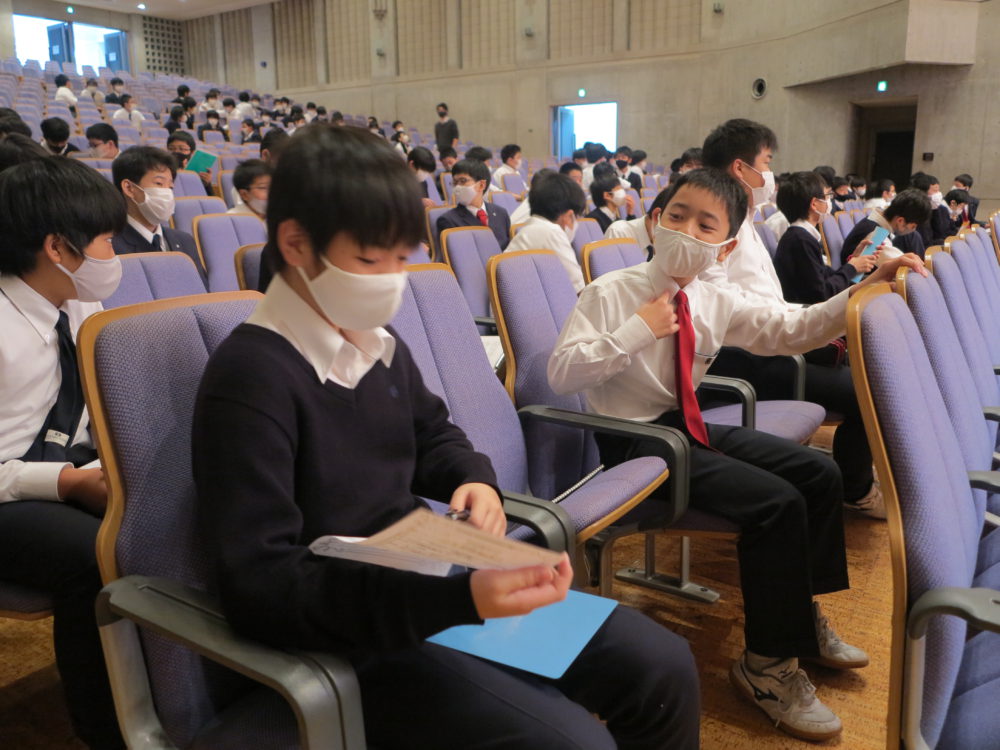 もちろん、聞く生徒たちの姿勢も大事です。今回はステージ上に立たなくても、自分が立つときは遠くありません。仲間の発表の様子を観察し、評価シートにコメントを記していきます。そして、一人の発表が終わるごとに大きな拍手をおくっていました。保護者の皆さまも2階座席からあたたかく見守ってくださいました。