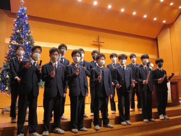 本日11月20日(金)、クリスマスツリー点火式を行いました。午後3時20分から、中1と有志の生徒たちが講堂に集まり、久保チャプレンの司式のもと聖書が読まれ、クリスマスを迎えるための準備が始まりました。