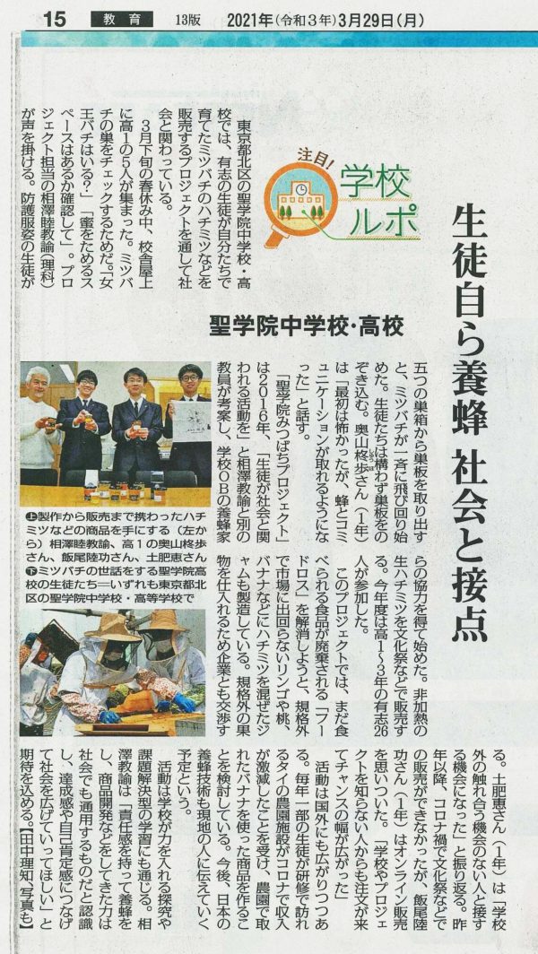 先日、毎日新聞の記者の方から取材を受けたことをお伝えしましたが、毎日新聞3月29日(月)の朝刊(全国版)の教育欄にある「注目学校ルポ」に、みつばちプロジェクトの活動が掲載されました。