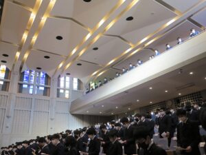 生徒たちは教室に入ると、先生やクラスメイトたちと新年の挨拶を交わし、始業式が行われる講堂へ移動しました。中学は午前9時10分から、高校は午前10時25分から、入れ替え制で行いました。
