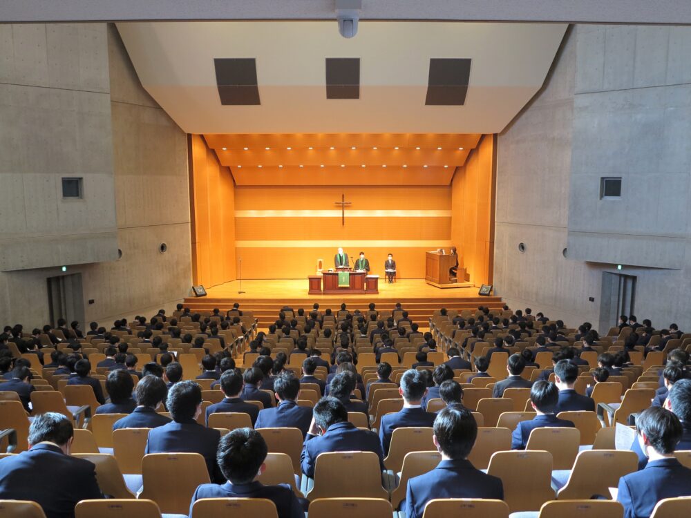 講堂の中はステンドグラスから陽の光が入ってとても明るく、オルガンの演奏が厳かに響き渡ると、生徒も教職員も自然と気持ちがきりっと引き締まります。そして、伊藤校長先生からのメッセージに、一人ひとりが心の中で向き合います。