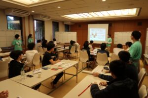 湯河原の宿泊施設に戻って、フィールドワークしたことを整理し、考える問いとなる答え(解決策)を探っていきます。各ツアーの中で、4つのグループに分かれます。毎年、この行事でお世話になっている株式会社リディラバの皆様にご協力いただき、各班のファシリテーターとして入っていただいております。リディラバの皆様の助言により、グループの生徒たちも難しい社会課題の解決策を考えていっております。各グループで、問いの解決策について、プレゼンテーションの資料を作成していきます。