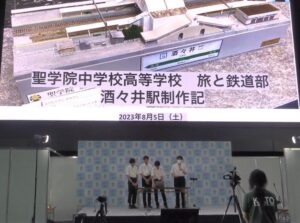 中・高合同で、高校生を中心とする模型班の生徒たちが4月から約4か月かけて制作し、4年ぶりに出場しました。今回は、千葉県にある「JR成田線 酒々井(しすい)駅」を制作しました。部員やOBの先輩方をはじめ、多くの方が見学に来てくださいました。