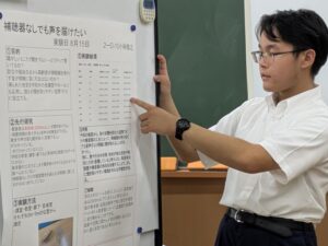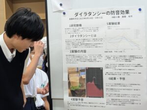 4月から約6カ月かけて取り組んだ研究には創意工夫が凝らされ、ポスターやプレゼンテーションには熱い想いが込められていました。特に、研究テーマは、普段の生活の中で抱いた小さな疑問から生まれたものが多く、「荷物の重心の位置が長距離歩行に与える影響」「周囲の振動が集中力にどう影響するか」「なぜ体に力が入っていると水に浮かないのか」など、高校生ならではの身近で柔軟な発想が光るものが多く見られました。
