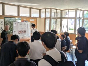 理科課題研究発表会を9月27日(土)に開催しました。 これは、理系選択の高校2年生が、自分で設定した研究テーマに基づき、実験・観察した内容をポスターにまとめ、グループごとに発表するイベントです。午後1時にスタートし午後3時30分まで、会場のいたるところで様々な発表が繰り広げられました。