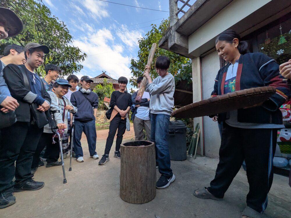 この日はパッキヤ村にホームステイしました。アカ族とラフ族が共に暮らす村です。村の若者たちの案内でアカ族の餅つきを体験したり、機織りを見学したりするうちに、生徒たちは村の雰囲気になじんでいきました。