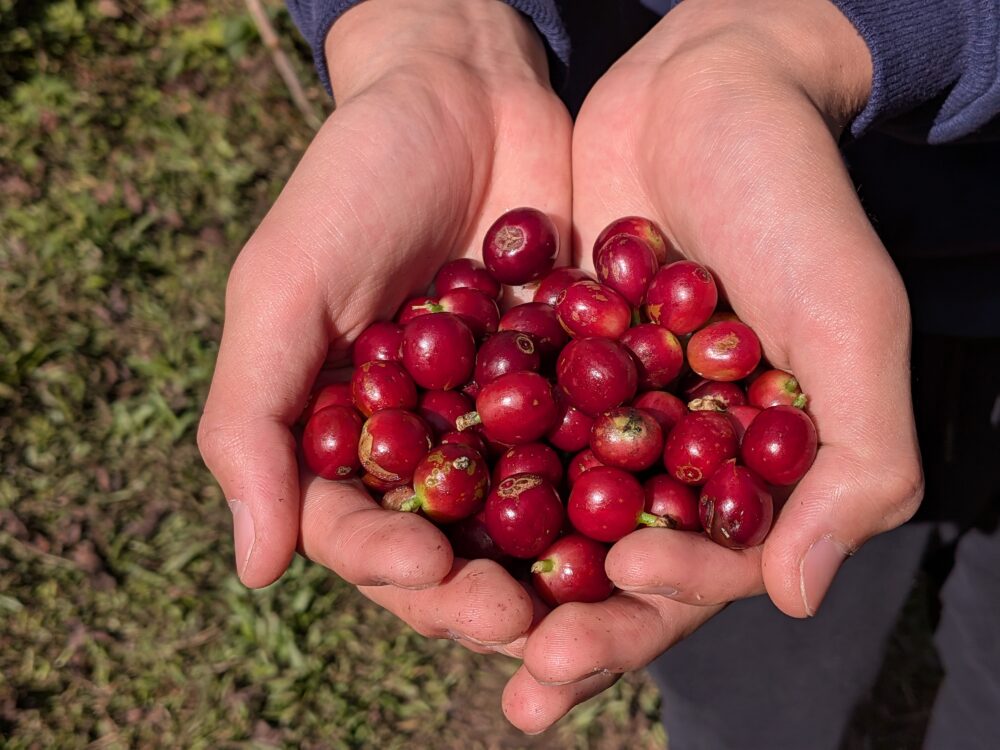 摘み取った実は、その日のうちに赤い皮を剥き、水洗いと発酵をくり返し、乾燥させて薄皮を剥き、焙煎して水分が抜け、商品になるまでにどんどん軽くなっていきます。精製の過程で不出来な豆を取り除きます。暁の家の有機コーヒー豆を基準に考えると、200グラムの焙煎豆を得るために約1.6キログラム、800粒以上のチェリーを収穫する必要があります。1粒ずつ赤く熟した実を選び、傷を避けながら手で摘み取る作業は、数字で見るほど単純ではありません。