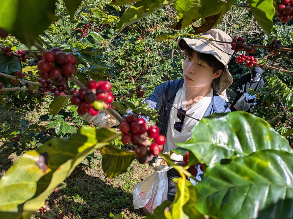 中野さんの農園は、標高1,100メートルの高地にあります。クルマを下りて山の尾根を伝って歩くと、木々の間から山々の連なりが見渡せます。道の脇の斜面にはコーヒーの木が植えられ、赤く熟した実をつけています。私たちは斜面を下りて、実を一つ一つ摘んでゆきました。人間には厳しい環境ですが、ここでこそ高品質なアラビカ種コーヒー豆が採れるのです。