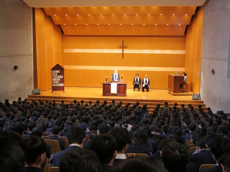 開式に先立ち、久保チャプレンから新入生へ向けて、聖書や讃美歌の引き方、主の祈りについてのレクチャーが行われました。多くの新入生にとって、聖書を手に取るのは初めての経験でしたが、一頁ずつ丁寧にめくり、しおりを挟む姿が印象的でした。式典では、森下チャプレンによる聖書朗読と祈祷が捧げられた後、伊藤校長が新年度の指針となるメッセージを語りました。