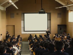 オリエンテーション最終日には、保健体育科の髙橋孝介教諭と養護教諭の小野梓教諭による性教育の講話を行いました。髙橋教諭からの「男子校ノリって何だろう?」という問いかけに対し、生徒たちは自身の言動を真摯に振り返り、無意識のうちに相手の人権を侵害していないか、他者への尊重について深く再考する機会を得ました。